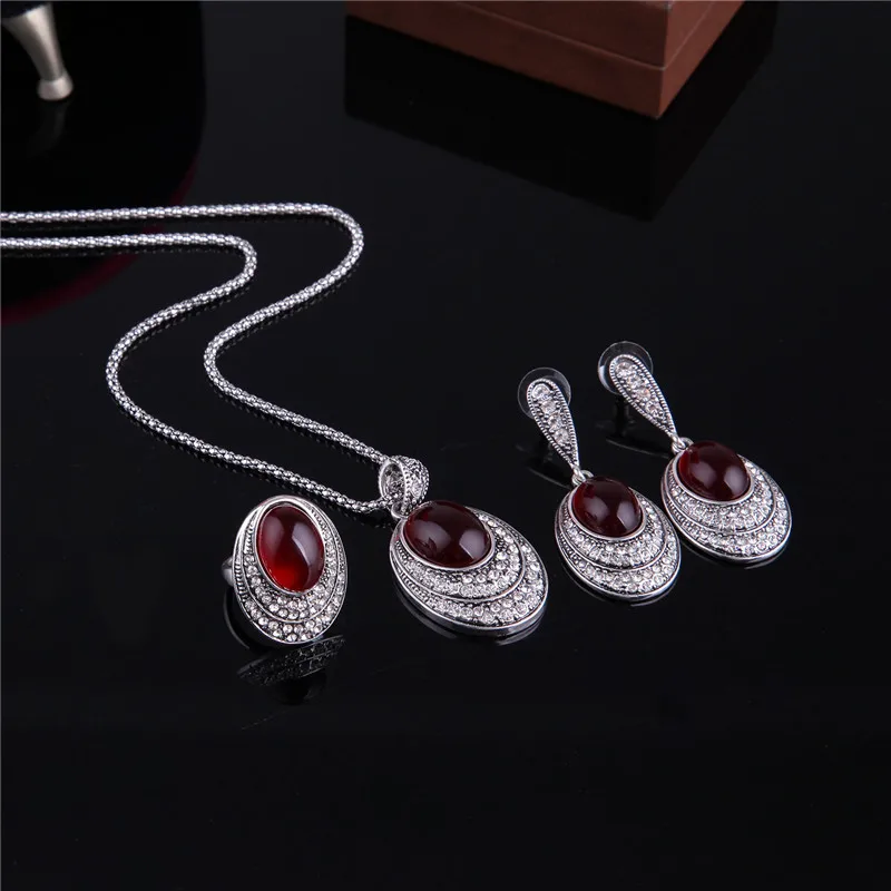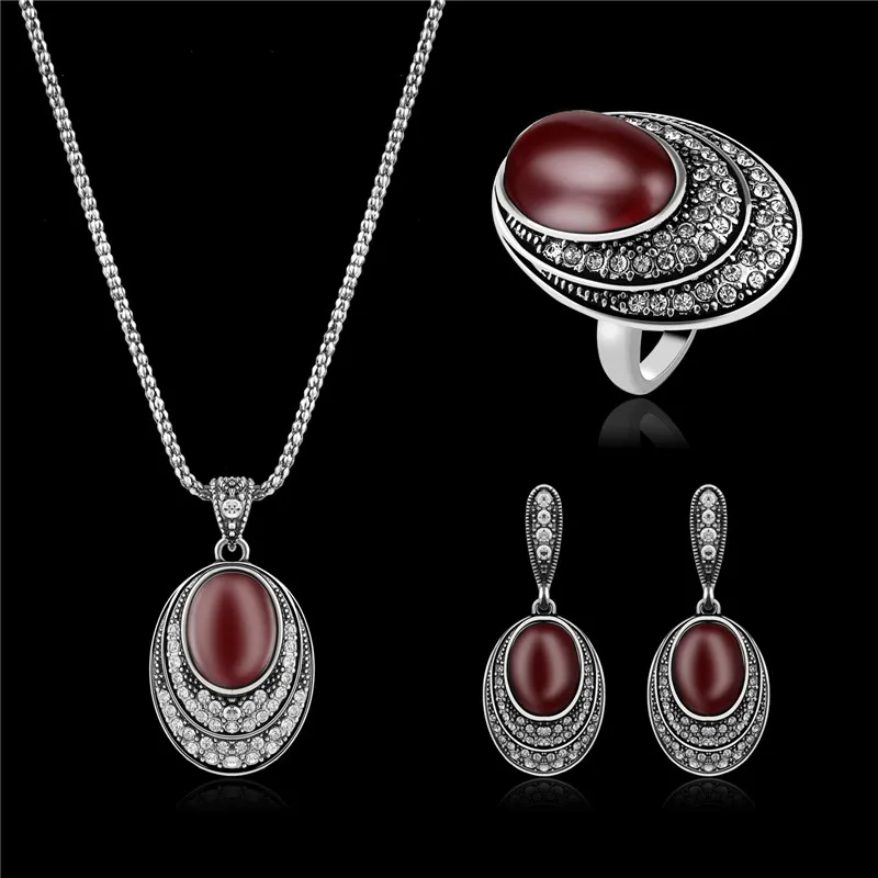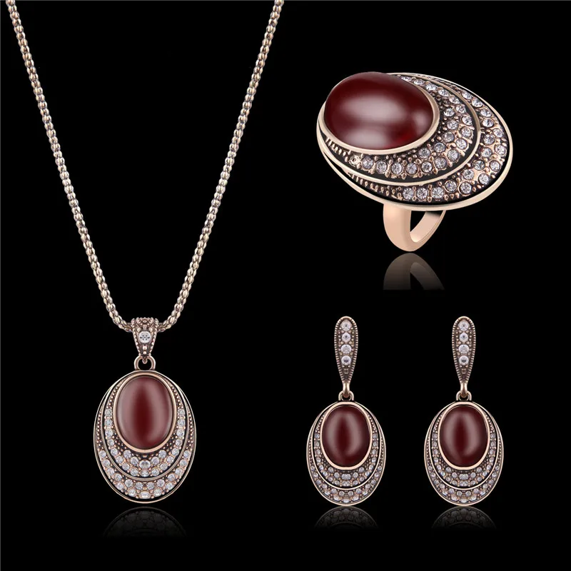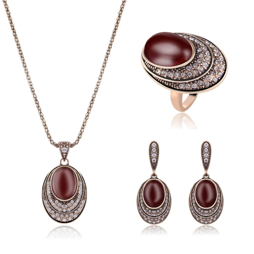 New Vintage Bridal Jewelry Sets For Women Full Rhinestone Crystal Big Oval Red Resin Stone Pendant Neck