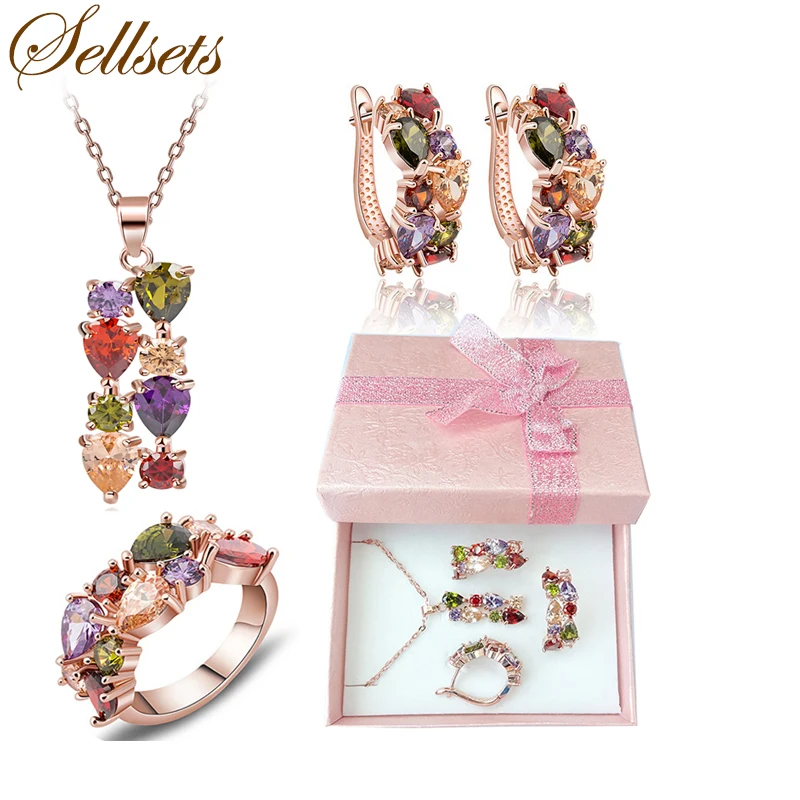 Buy Sellsets Free Shipping Ring Size 6-9 Rose Gold Color Multicolor Zircon Necklace Earring Set Cubic Z