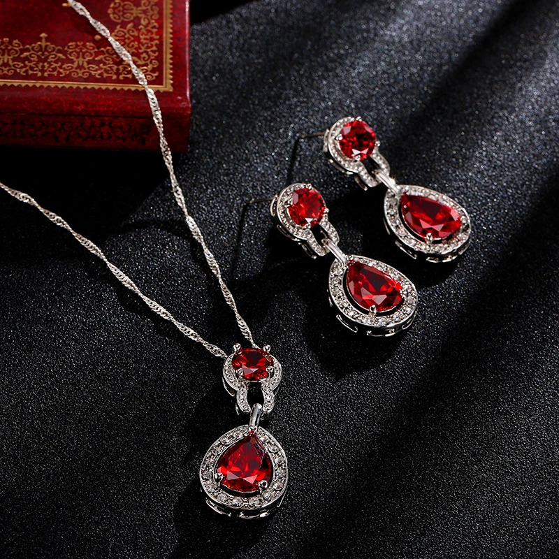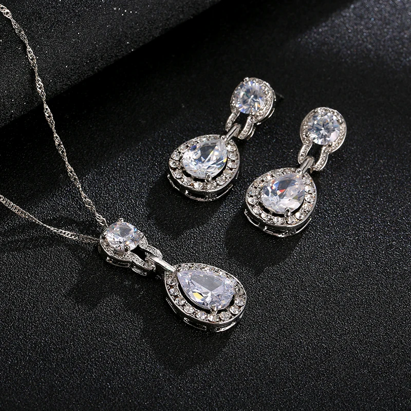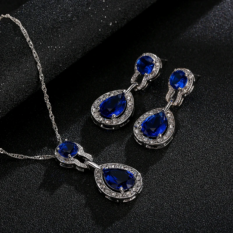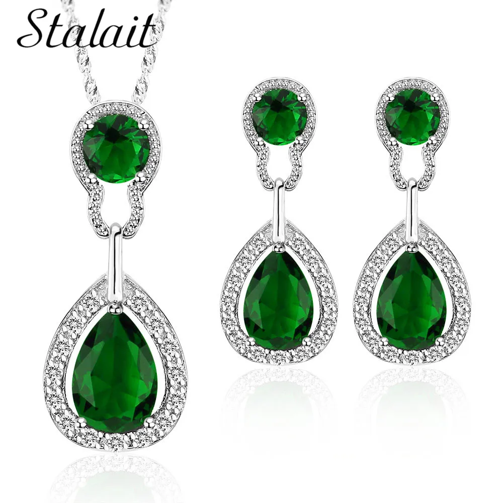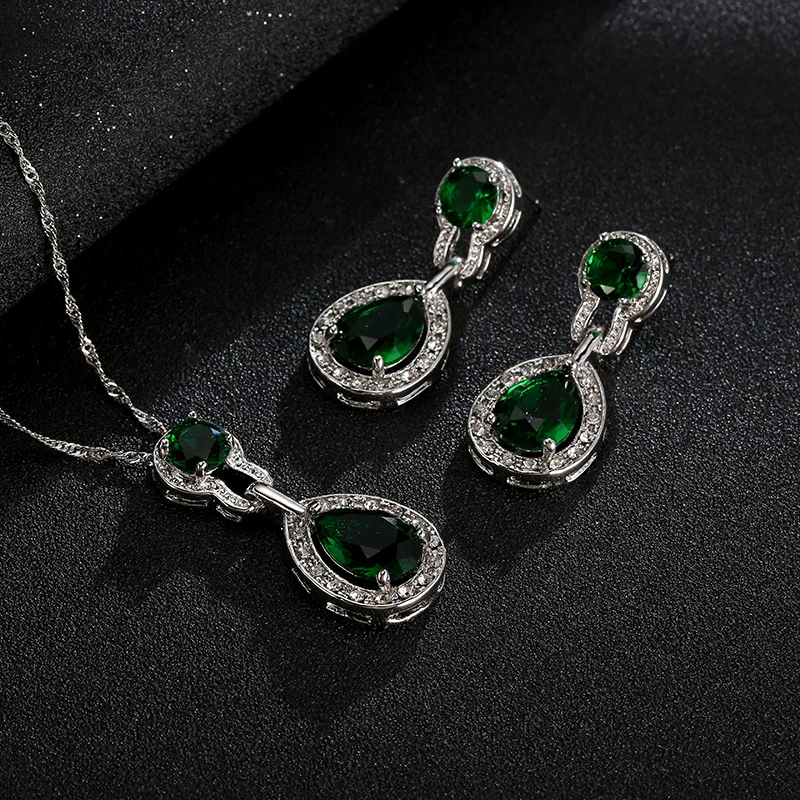 Promo Bridal Wedding Jewelry Sets For Women Green Crystal Silver Color Tear Drop Indian Jewelry Necklace